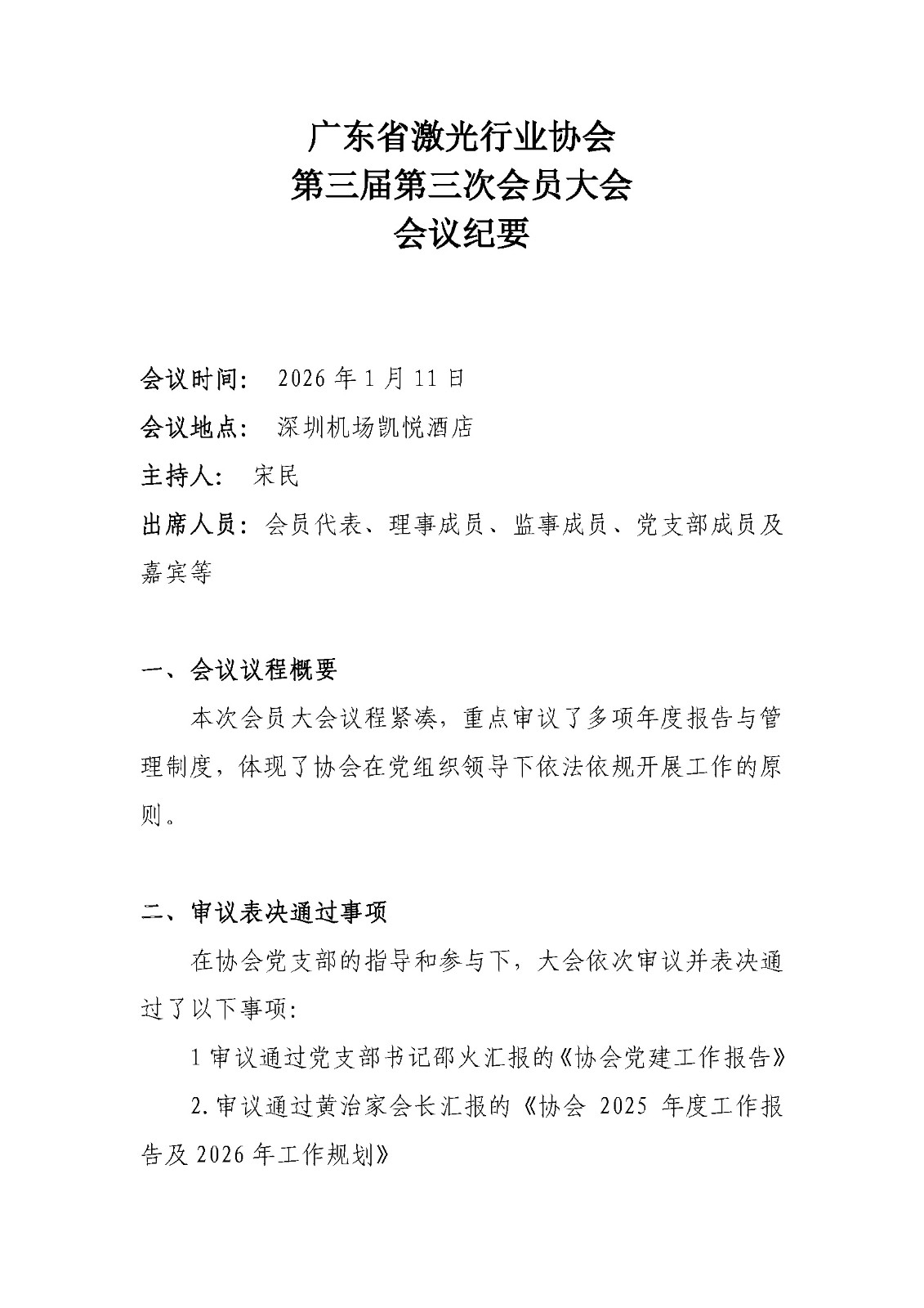根据协会《章程》有关规定,广东省激光行业协会第三届第三次会员大会已于2026年1月11日顺利召开。现将本次会议纪要予以公告,请各位会员审阅。