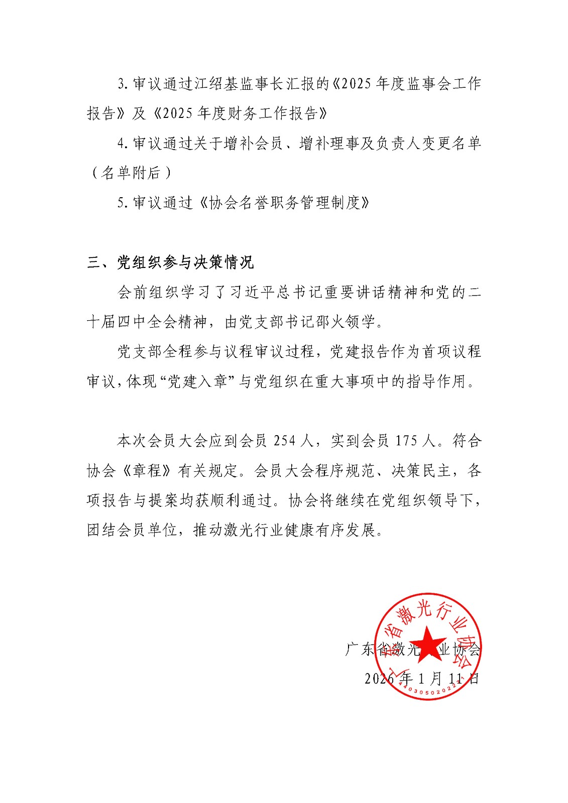 根据协会《章程》有关规定,广东省激光行业协会第三届第三次会员大会已于2026年1月11日顺利召开。现将本次会议纪要予以公告,请各位会员审阅。